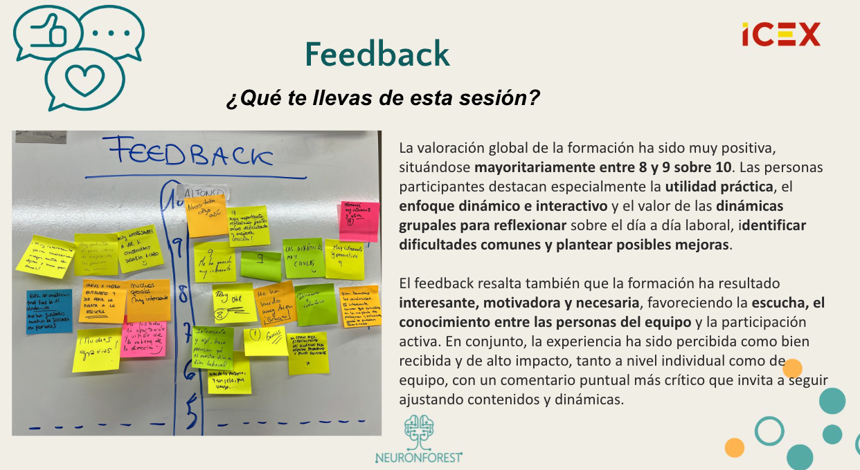 👉 En conjunto, la sesión tiene un impacto directo tanto a nivel individual como de equipo, facilitando conexión, claridad y propuestas reales de mejora.